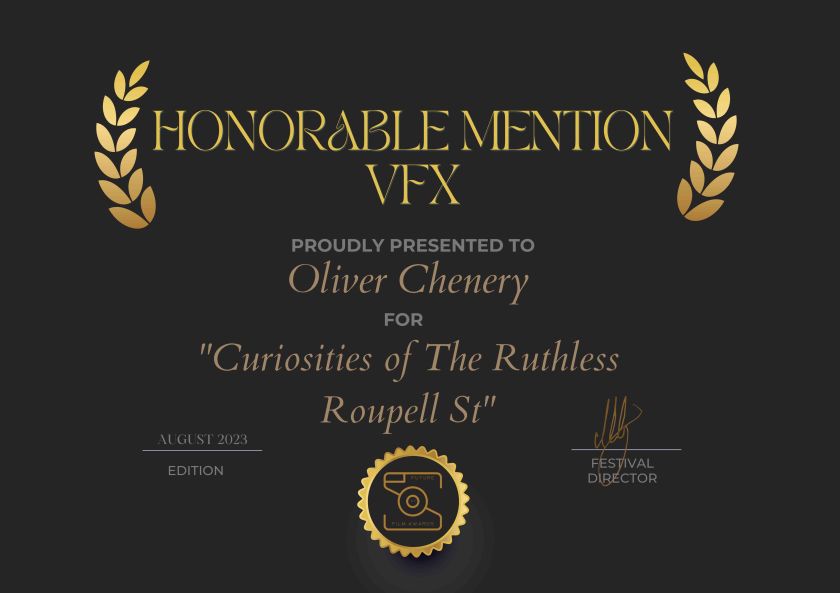 Congratulations to the makers of the short VFX film “Curiosities of The Ruthless Roupell St“, which has won an Honourable Mention in the category of Best Super Short Film at the Future of Film Festival.