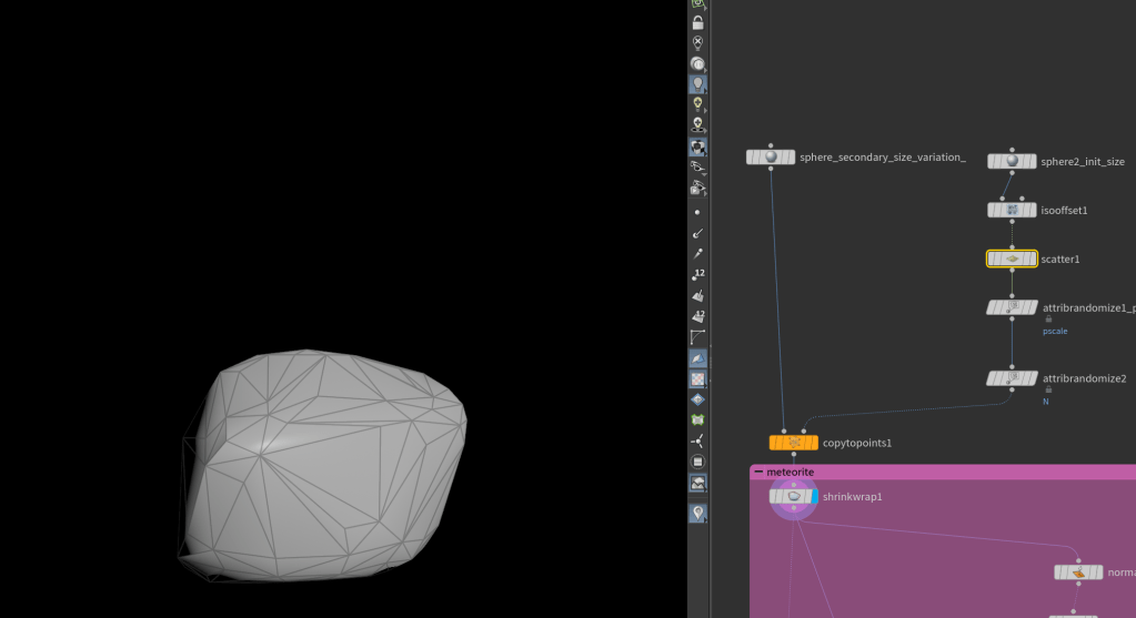 So in this generator, there are a few controls in order to control the general scale of the rock, controls for the veins and the noise, and also whether to make it into a meteorite or not. What is interesting about this setup is that is also begins with the scattering of some points.