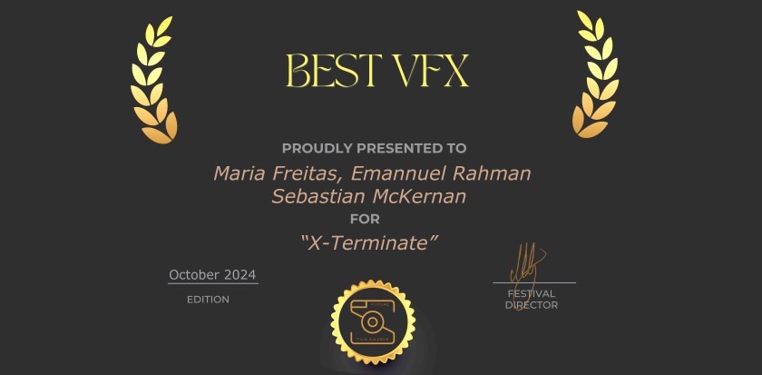 Directed by Maria Freitas and produced by Emmanuel Rahman, X-Terminate was a collaboration between undergraduate VFX students and animation students at Escape Studios, working together to create an original story. This is its fourth festival award.