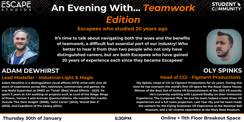 Our “Evening With…” events are an opportunity for our students and soon-to-be-Escapees to meet working professionals in person, listen to their experiences, and find out more about how the industry actually works.