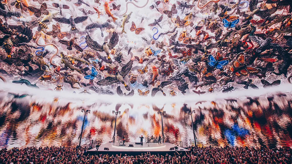 One of the most impressive examples is U2’s residency at Sphere Las Vegas. The venue features a 16K wraparound LED screen, creating enormous, moving digital backdrops that enhance the band’s performance. The visuals were designed by Treatment Studio, with additional work from ILM and artist Marco Brambilla.